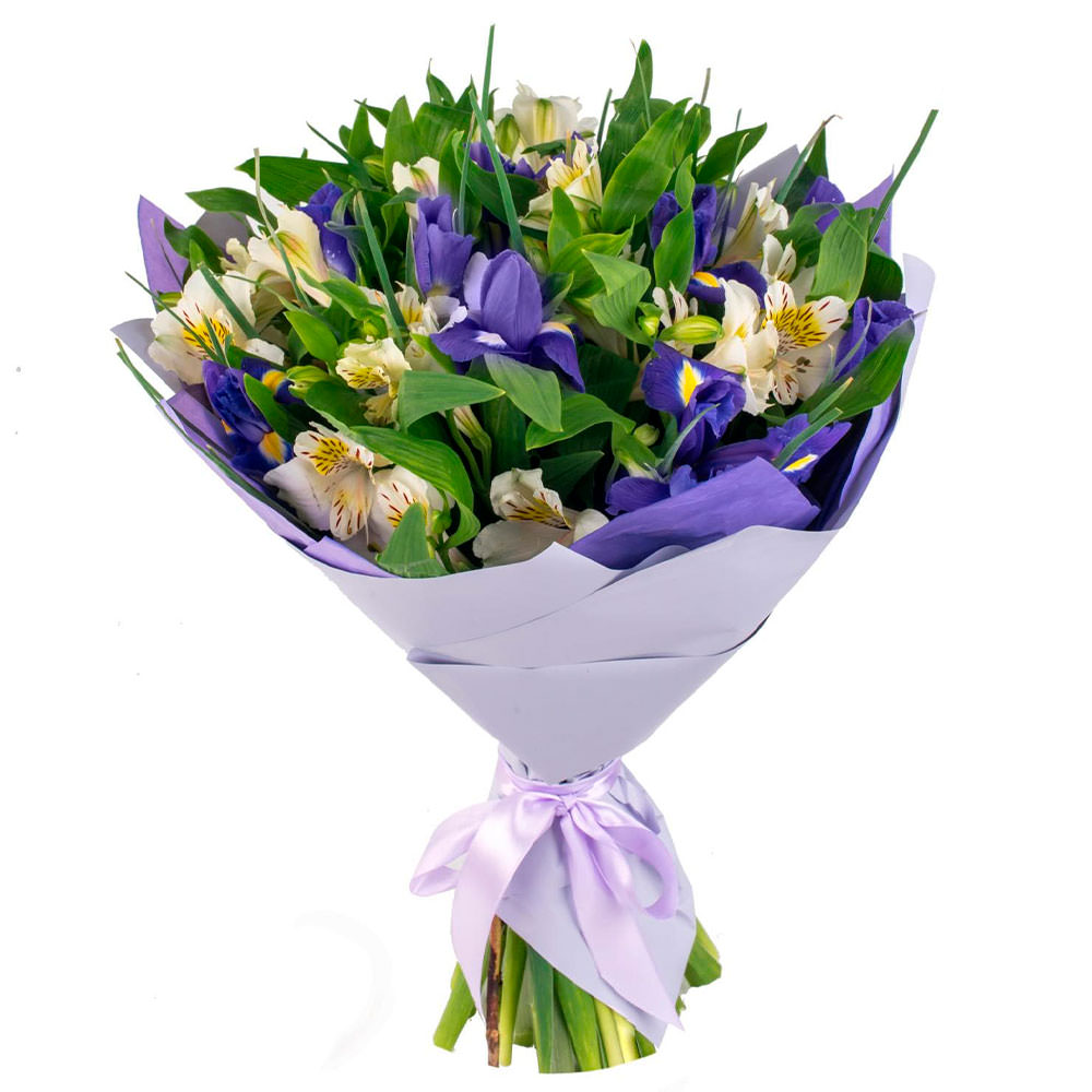 Эта нежная композиция в сиреневых и белых тонах создаёт атмосферу легкости и свежести. В букете собраны ирисы и белые альстромерии, дополненные изящной зеленью. Упакован в матовую плёнку и перевязан светло-фиолетовой атласной лентой, что придаёт ему элегантность. Такой букет идеально подойдёт для вручения на встречу выпускников, чтобы удивить и порадовать старых друзей.