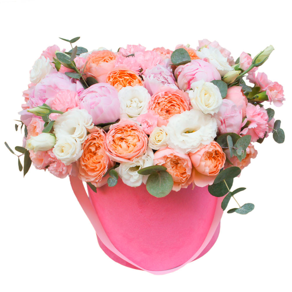Яркие розовые пионы, коралловые пионовидные розы и белые эустомы создают атмосферу нежности и романтики. Композиция дополнена свежими веточками эвкалипта. Цветы аккуратно уложены в розовую шляпную коробку, придающую композиции стильный вид. Этот букет станет прекрасным подарком для любимой женщины на День влюблённых и создаст атмосферу романтического вечера.