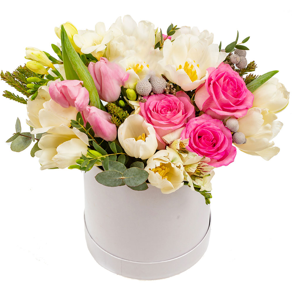 Этот букет очарует нежностью розовых роз и белых тюльпанов, дополненных альстромерией и фрезией. Композиция также включает изысканную брунию и свежий эвкалипт. Упакован в элегантную белую шляпную коробку, которая подчеркивает утонченность цветов. Подходит для создания романтической атмосферы на свидании, станет прекрасным подарком для любимой женщины.