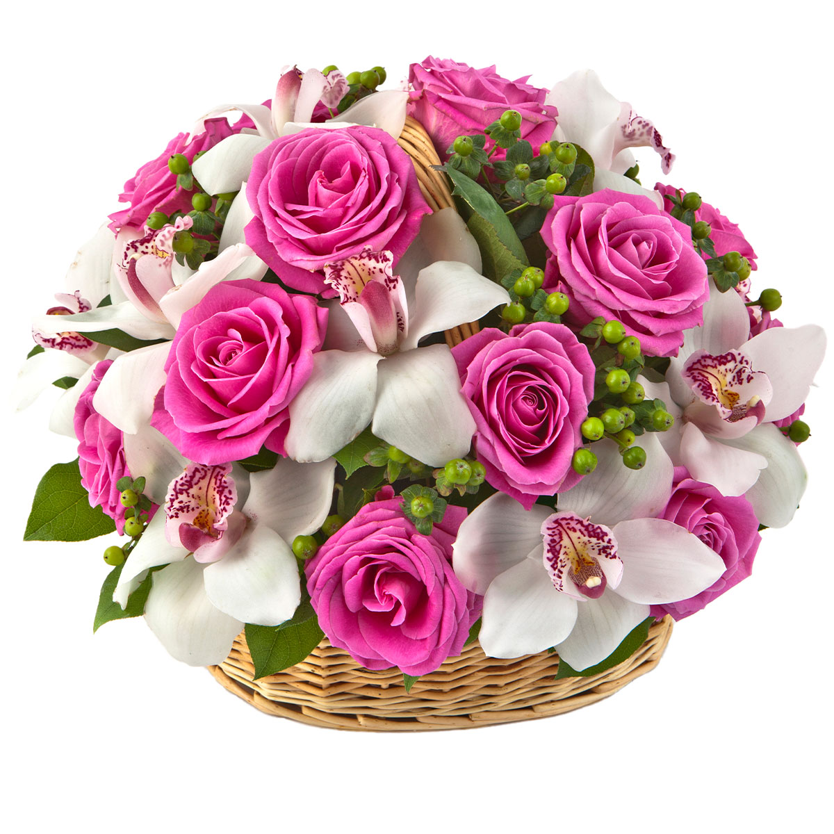 Яркие розовые розы, нежные белые орхидеи и свежий гиперикум создают атмосферу изысканности и лёгкости. Композиция оформлена в плетёной корзине, придающей ей уют и гармонию. Это идеальный подарок на юбилей для вашей сестры, который создаст радостное и праздничное настроение.