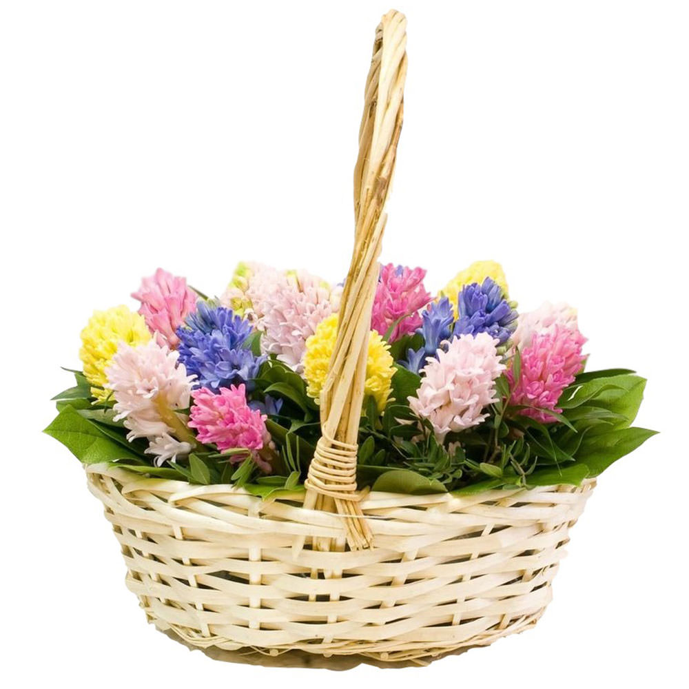 Яркая палитра нежных гиацинтов в розовых, желтых, голубых и белых тонах создаёт атмосферу весеннего настроения. В составе корзины — микс гиацинтов и эвкалипт, которые гармонично сочетаются в плетеной корзине. Эта композиция станет прекрасным подарком для жены на День влюблённых, наполняя пространство романтикой и свежестью.