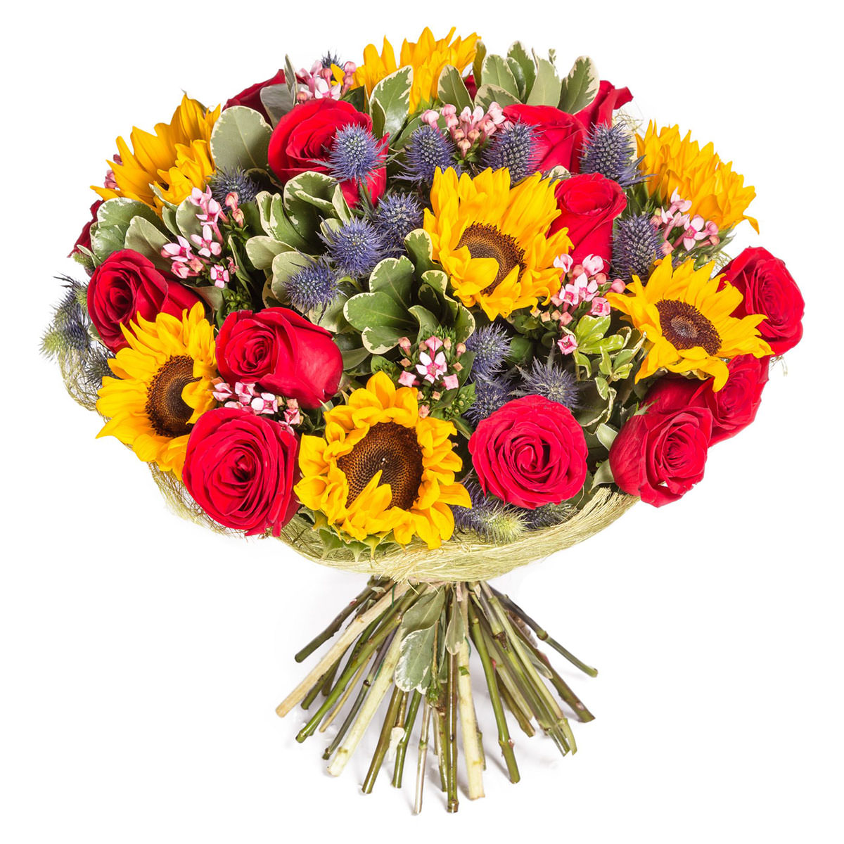 Этот букет дарит ощущение радости и тепла благодаря ярким жёлтым подсолнухам и красным розам. Композиция включает в себя розы одноголовые Ленинградские, ваксфлауэр, эрингиум, подсолнухи, эвкалипт и зелень. Упакован в матовую плёнку, украшен декоративной лентой. Создаёт атмосферу праздника и отлично подойдёт на вручение диплома для выпускника.