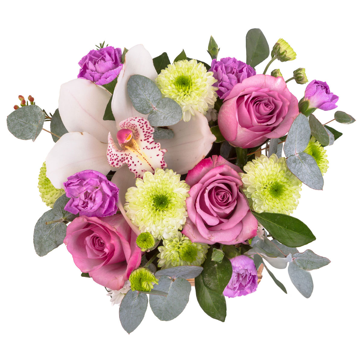 | Состав | Эвкалипт, Розы, Гвоздики, Хризантемы, Орхидеи |