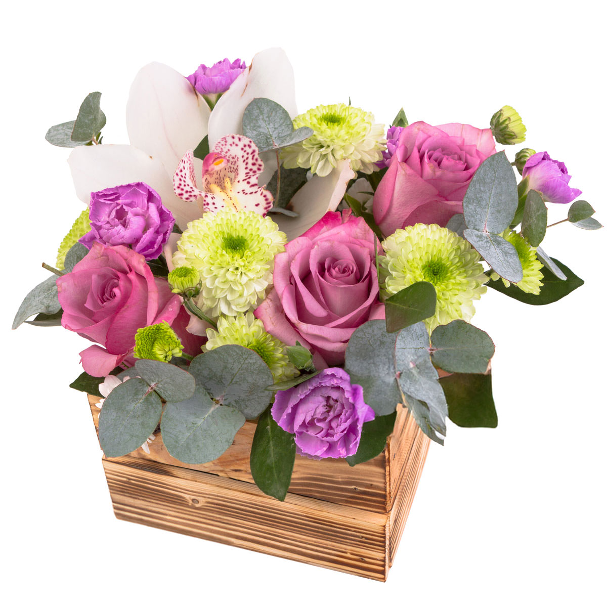Эта композиция очаровывает своей нежной цветовой гаммой, гармонично сочетая белую орхидею, розовые розы, зеленые хризантемы и сиреневые гвоздики с эвкалиптом. Цветы расположены в деревянном ящике, добавляя естественности и уюта. Композиция создаёт атмосферу легкости и романтики, идеально подходя для романтического вечера. Прекрасный подарок для любимой женщины.